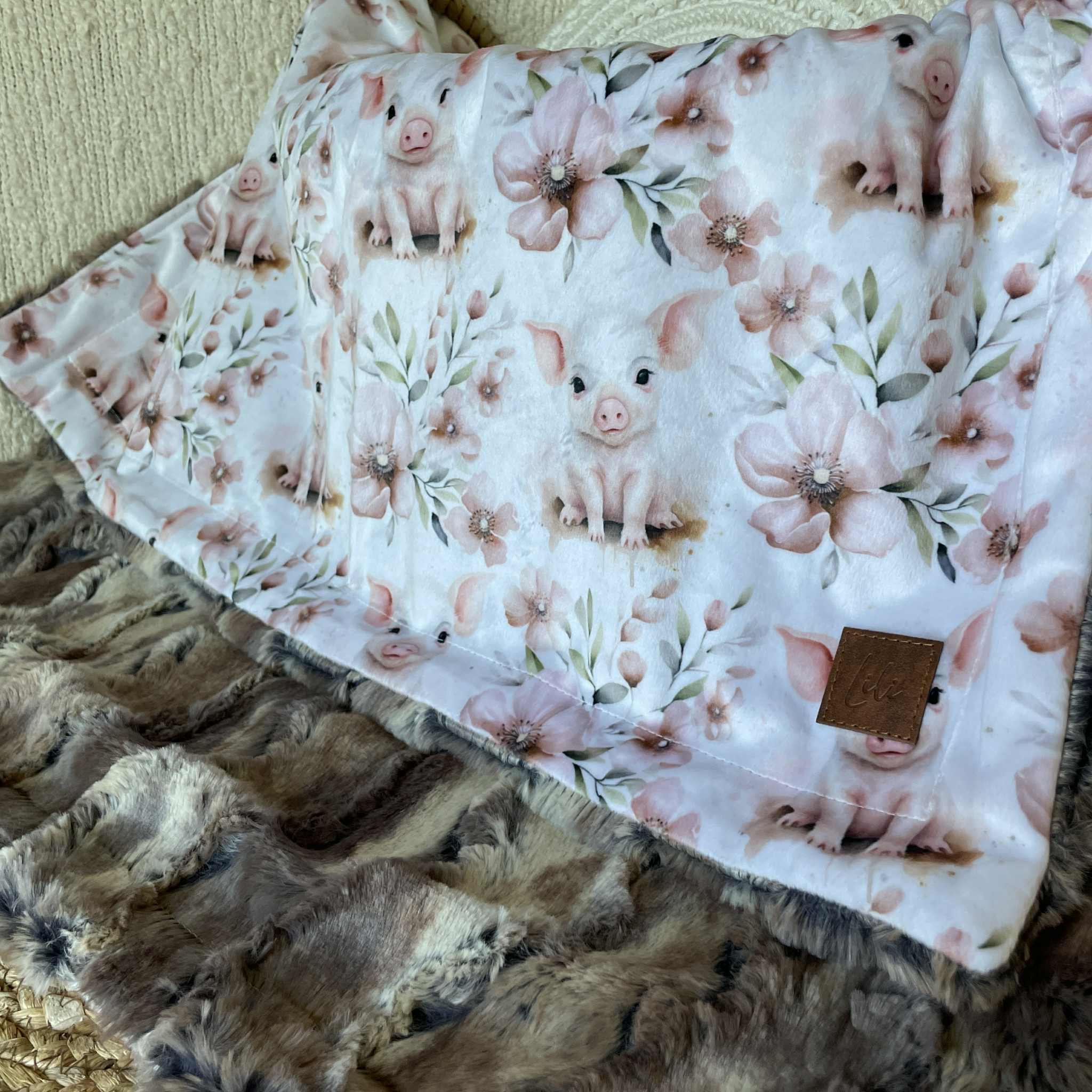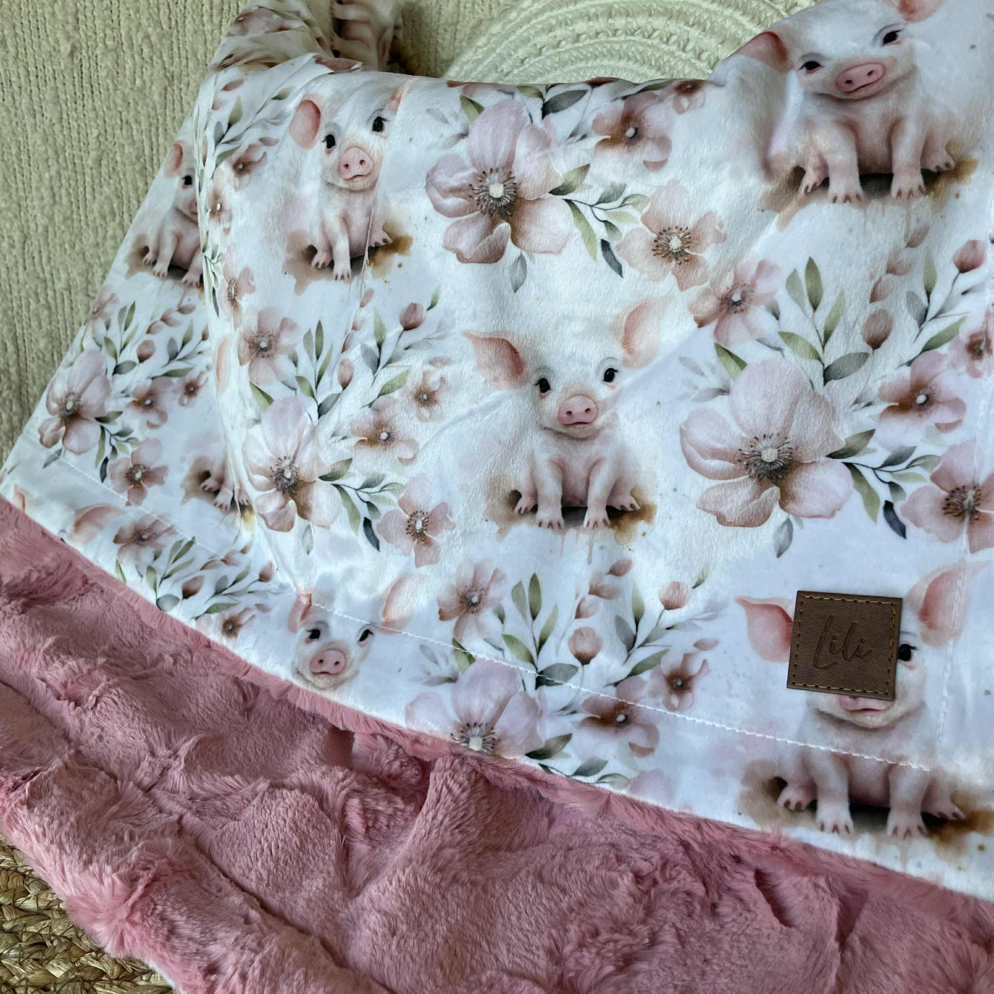 Un côté motif en minky imprimé au Québec ou en Amérique du Nord (pour certains motifs)