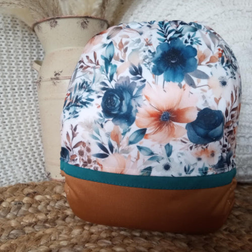 L’extérieur de la couche est fabriqué d'un polyester à motif et de deux doublures de tissu imperméable (PUL) 100% polyester. Plusieurs bandes de pul uni s'agencent au motif pour un look unique et original.