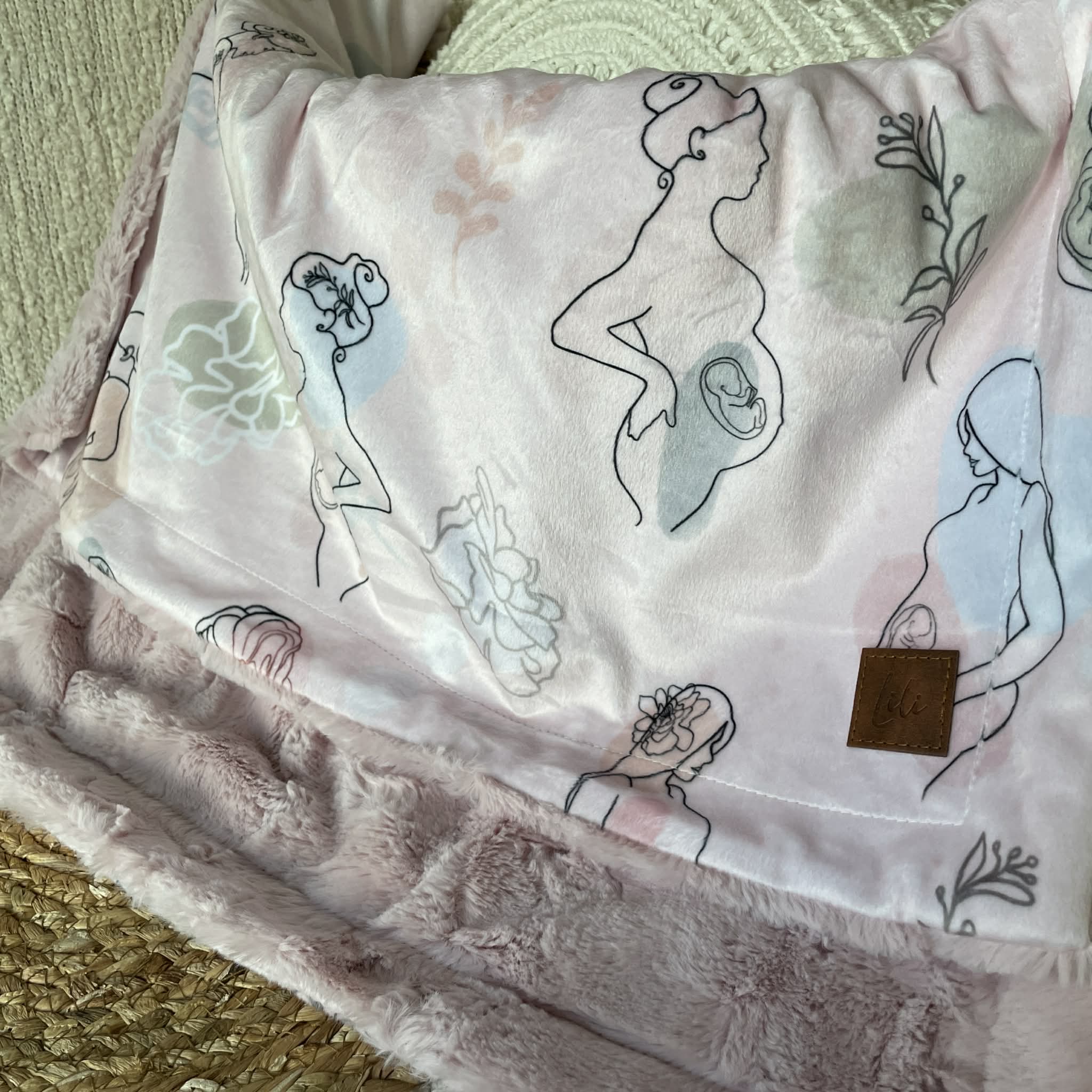 Un côté motif en minky imprimé au Québec ou en Amérique du Nord (pour certains motifs)