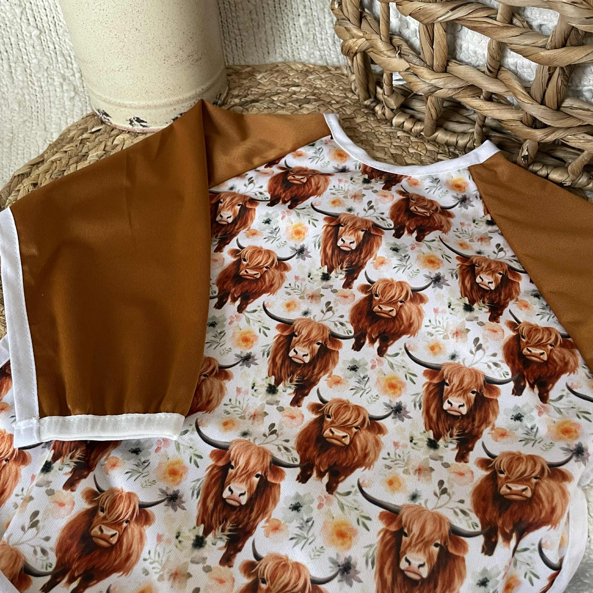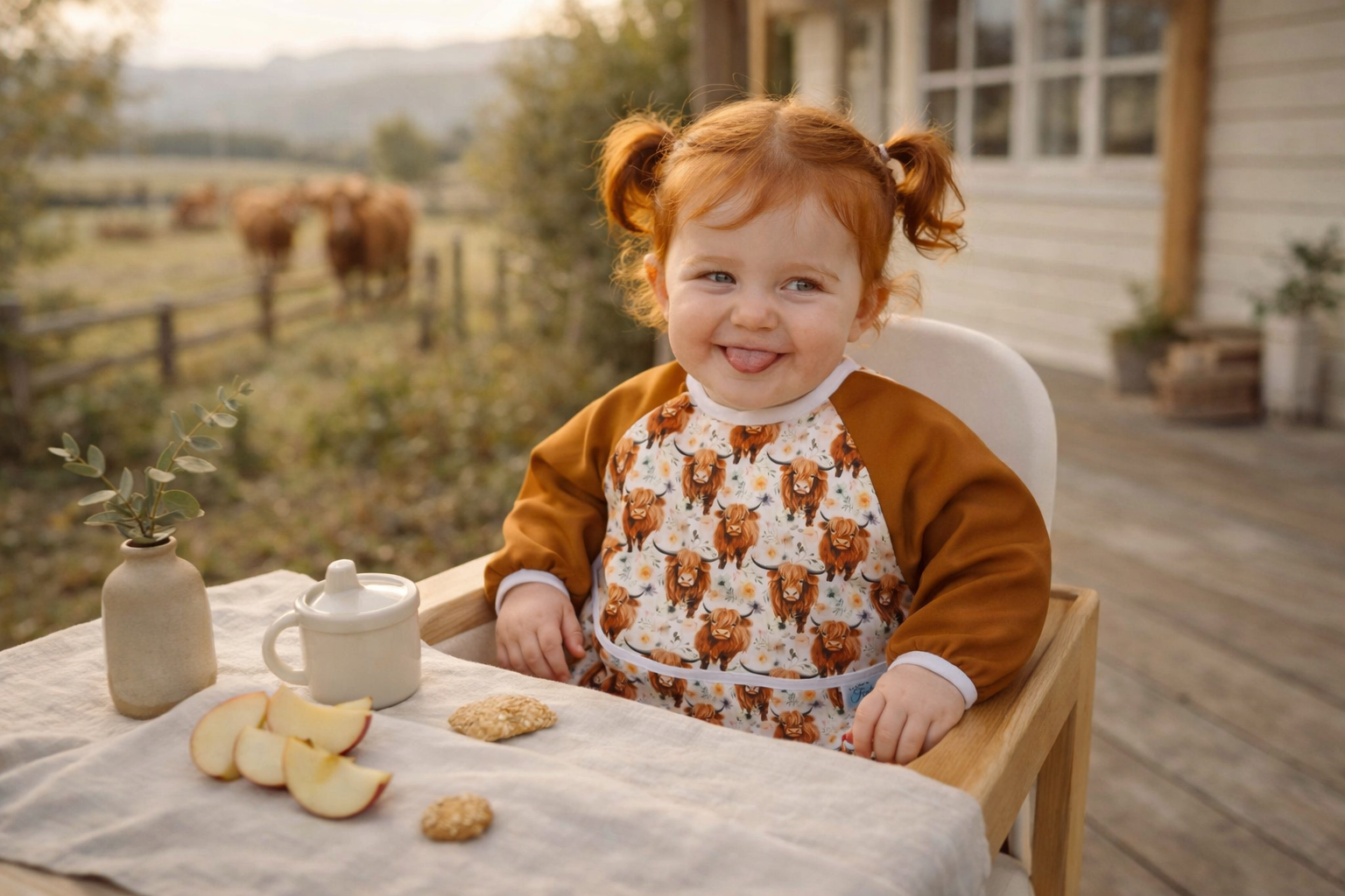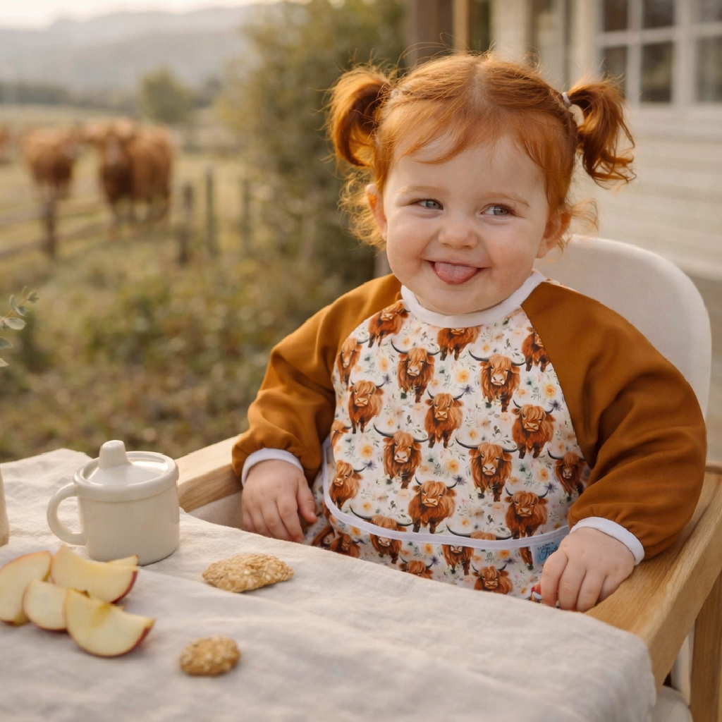 Pensée pour les repas, la garderie et les activités créatives, cette bavette imperméable à manches longues protège les vêtements tout en offrant une belle liberté de mouvement. Son détail signature : la cachette à miettes (pochette ramasse-miettes), qui retient miettes, bouchées et petites éclaboussures avant qu’elles ne se retrouvent partout.
