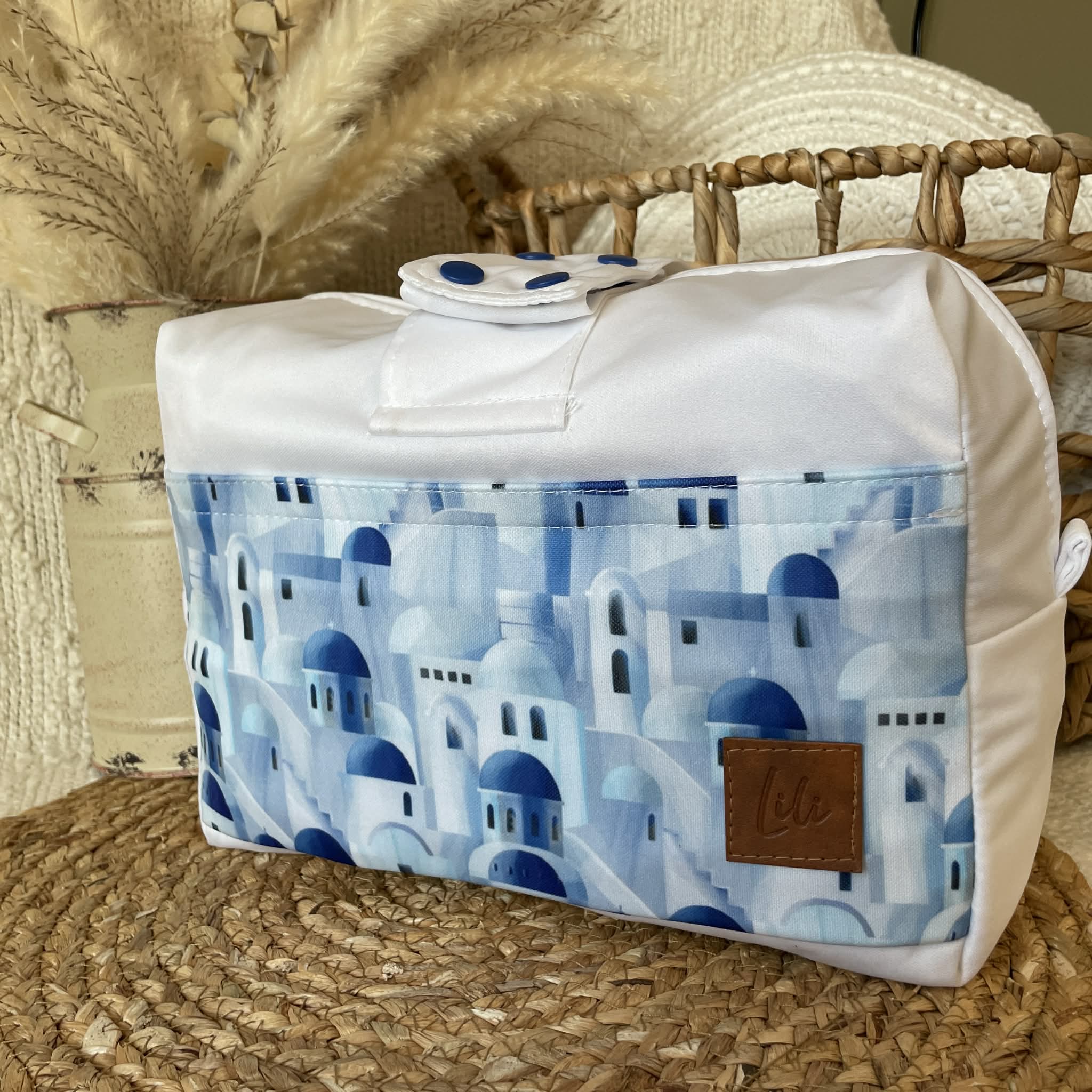 On y range 8 couches de taille unique avec un insert de jour Lili ou 6 avec un insert de nuit. Il contient une poche à motif à l'avant pour y ranger votre téléphone, portefeuille ou protège-carnet de santé. Il contient une autre poche à motif à l'arrière avec élastique pour vous permettre d'apporter des articles plus volumineux comme un paquet de lingettes humides par exemple ou bien une crème de change.