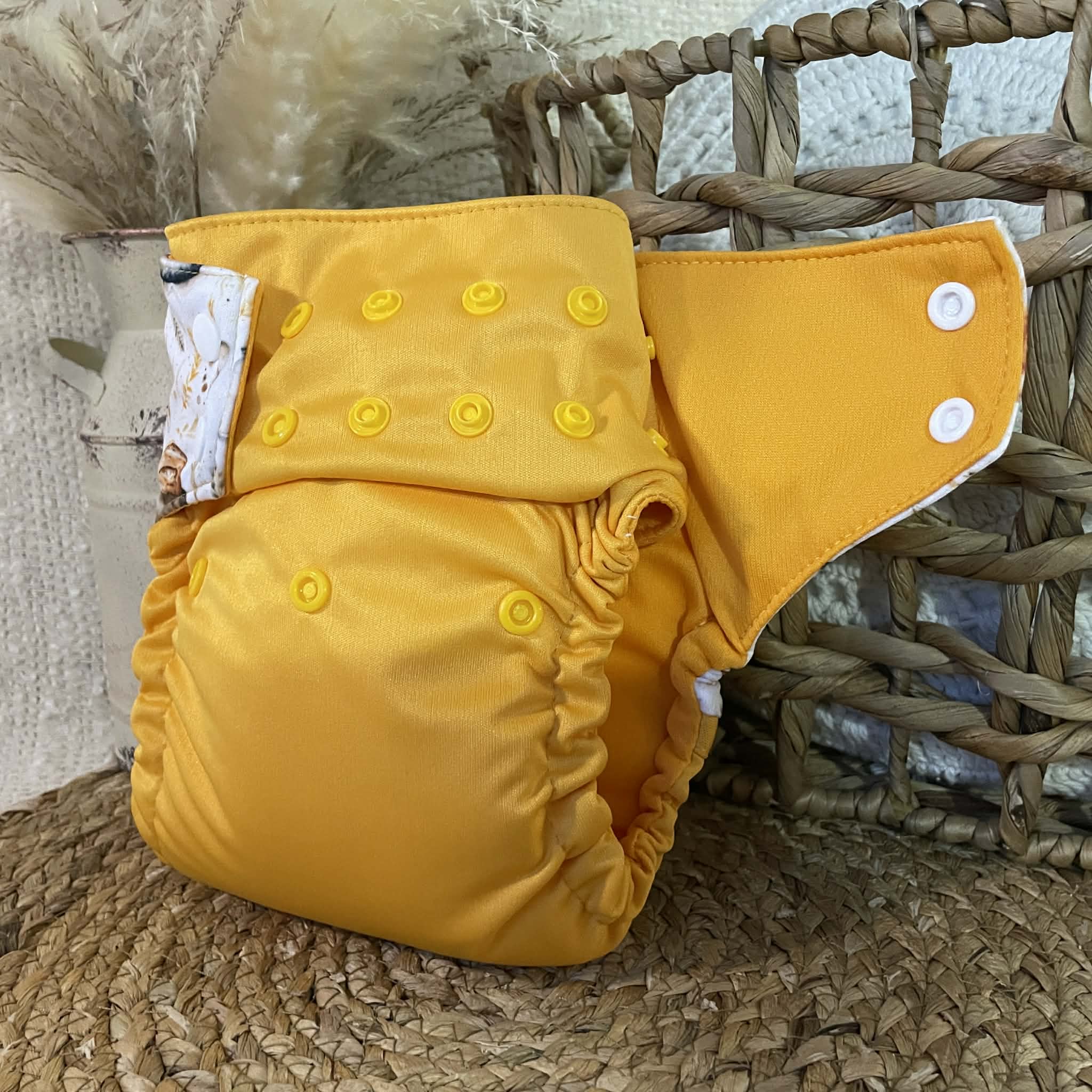 L’extérieur de la couche est fabriqué d'un polyester à motif sur toute la surface de la couche et celui-ci est entièrement doublé de tissu imperméable (PUL) 100% polyester. Notre couche tout motif est plus mince que notre couche wrap tout en étant aussi étanche !