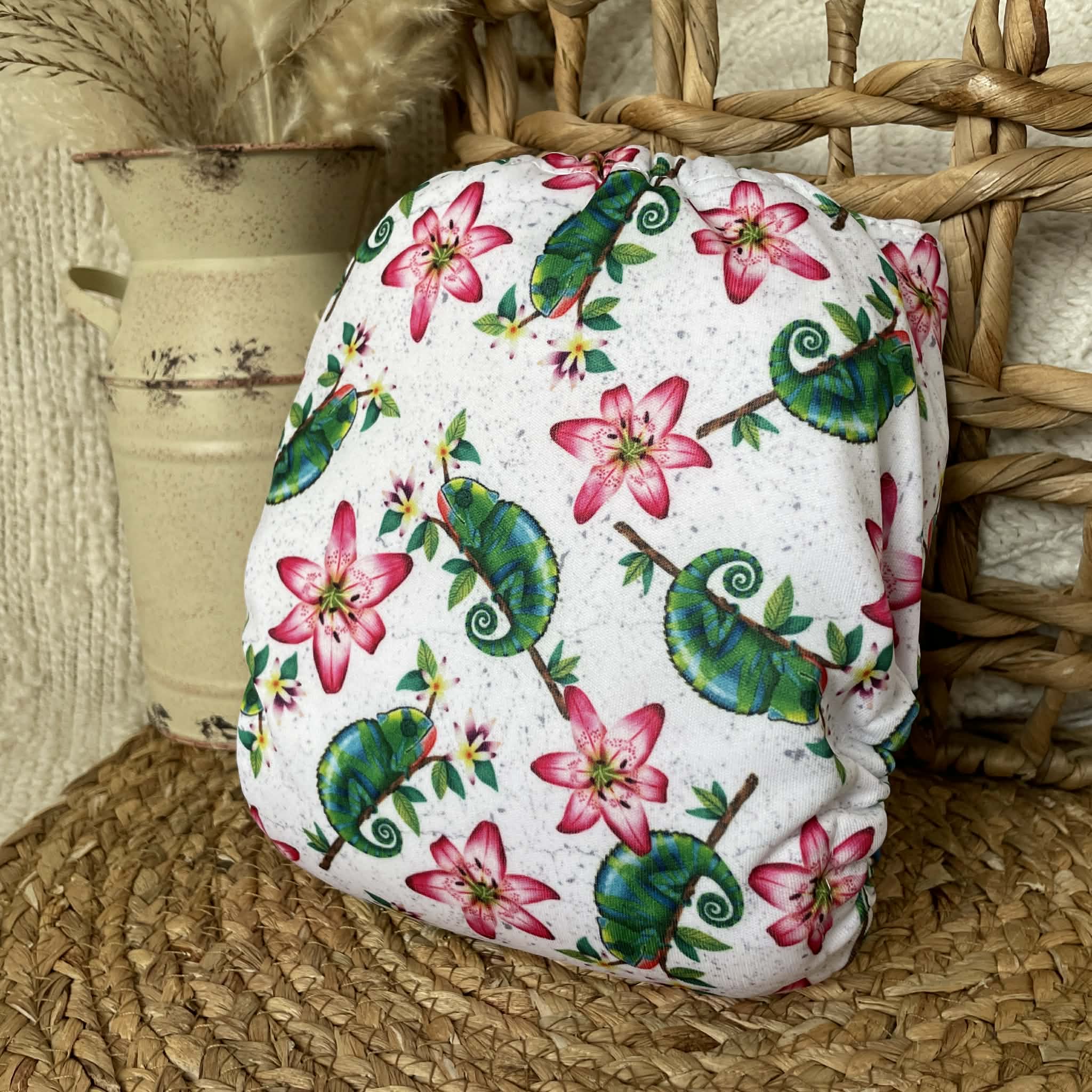 L’extérieur de la couche est fabriqué d'un polyester à motif sur toute la surface de la couche et celui-ci est entièrement doublé de tissu imperméable (PUL) 100% polyester. Notre couche tout motif est plus mince que notre couche wrap tout en étant aussi étanche !
