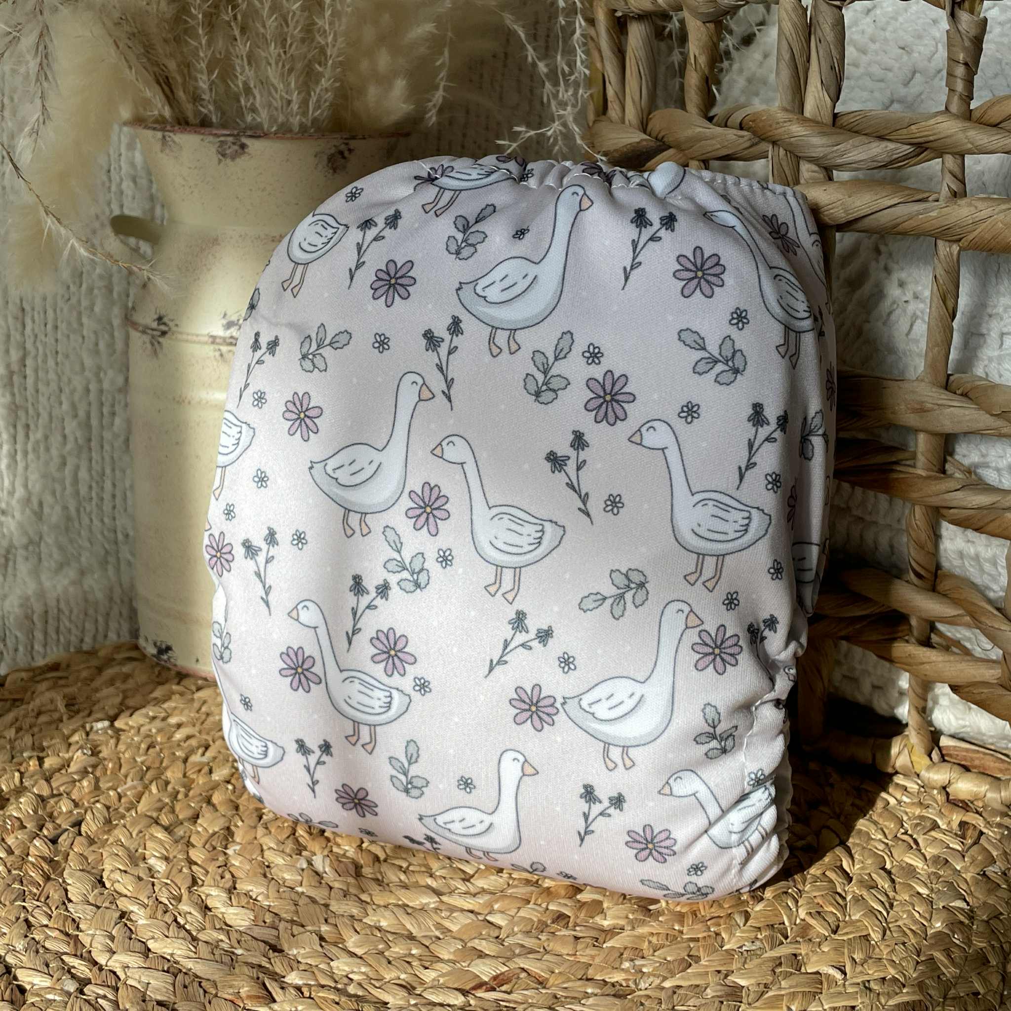 L’extérieur de la couche est fabriqué d'un polyester à motif sur toute la surface de la couche et celui-ci est entièrement doublé de tissu imperméable (PUL) 100% polyester. Notre couche tout motif est plus mince que notre couche wrap tout en étant aussi étanche !