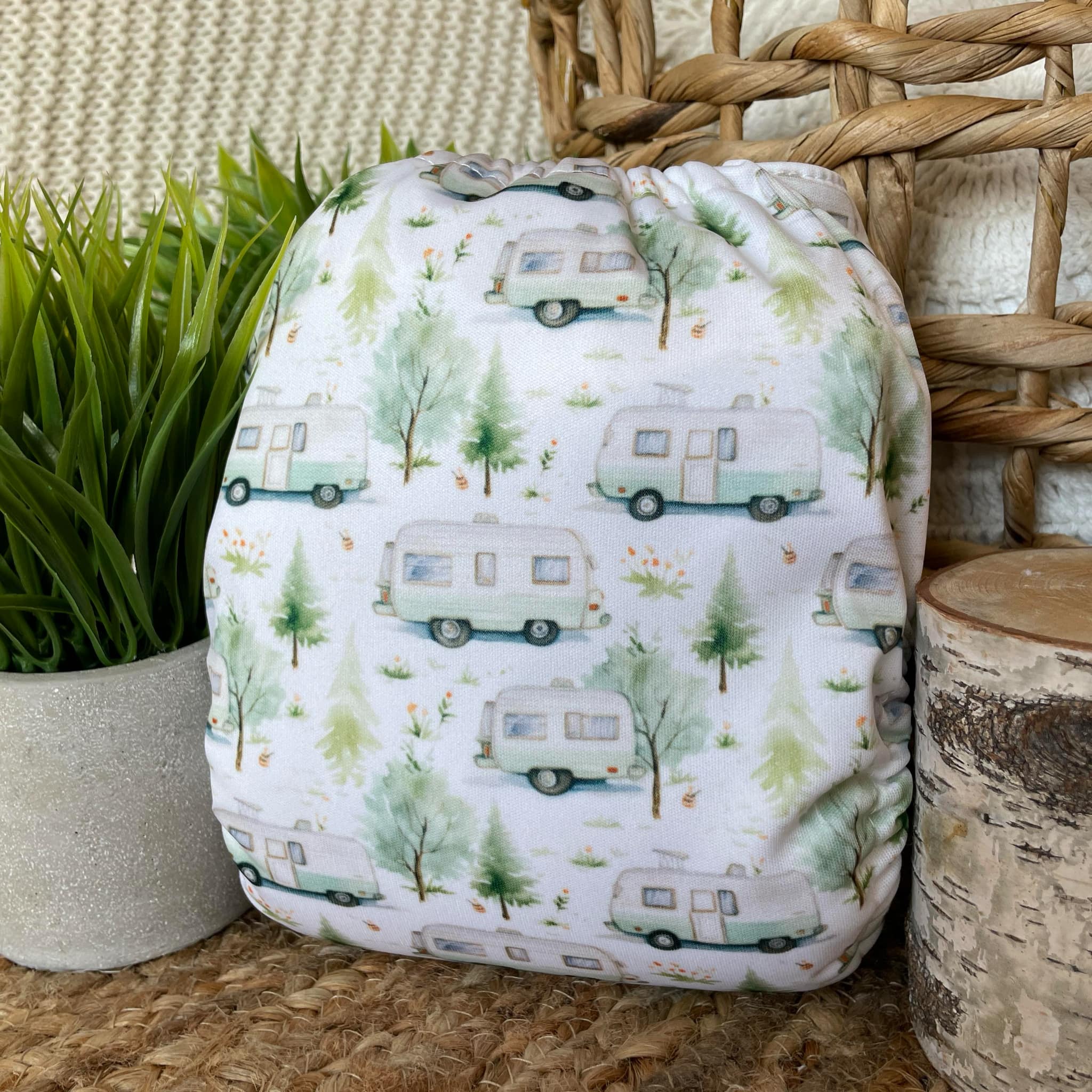 L’extérieur de la couche est fabriqué d'un polyester à motif sur toute la surface de la couche et celui-ci est entièrement doublé de tissu imperméable (PUL) 100% polyester. Notre couche tout motif est plus mince que notre couche wrap tout en étant aussi étanche !