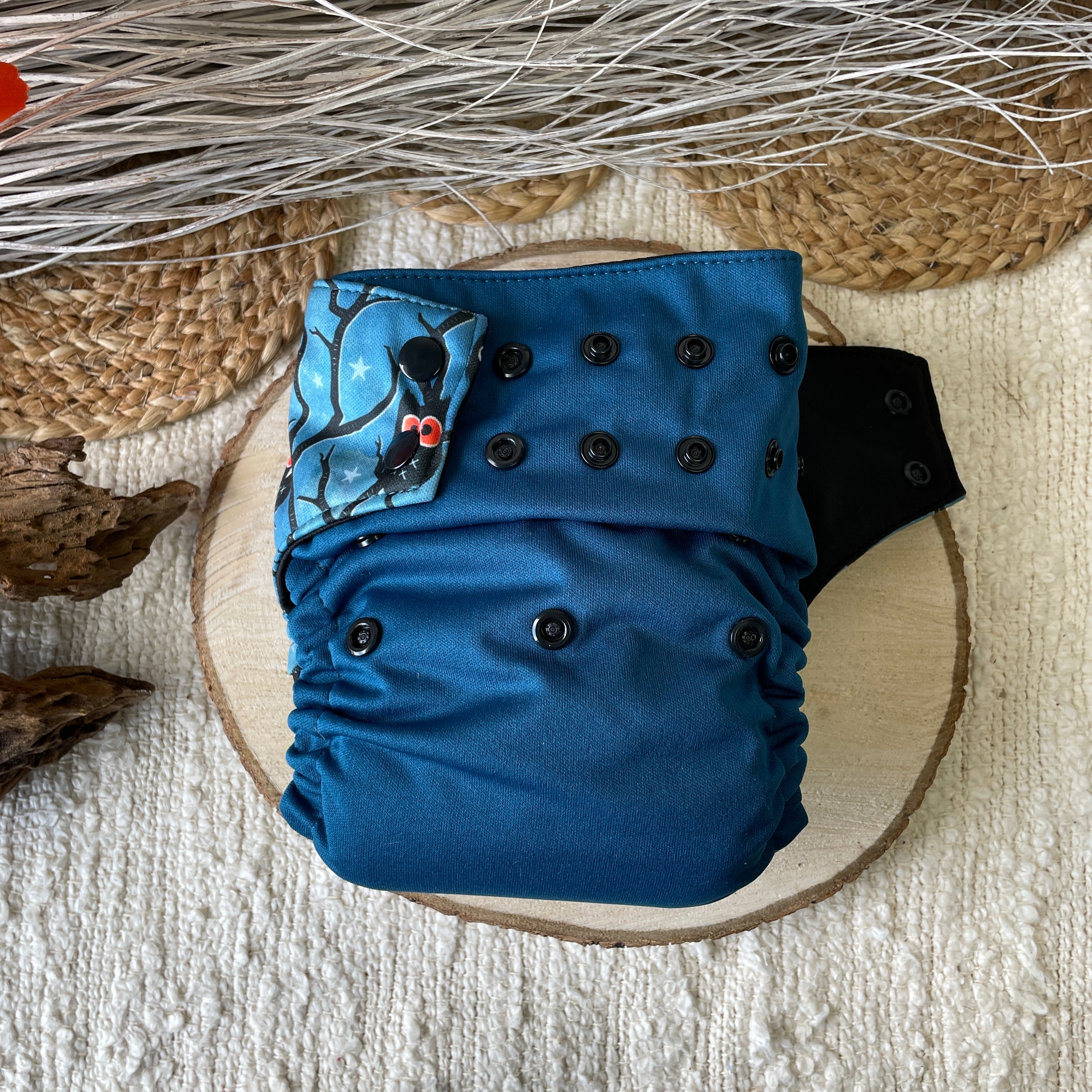L’extérieur de la couche est fabriqué d'un polyester à motif et de deux doublures de tissu imperméable (PUL) 100% polyester.