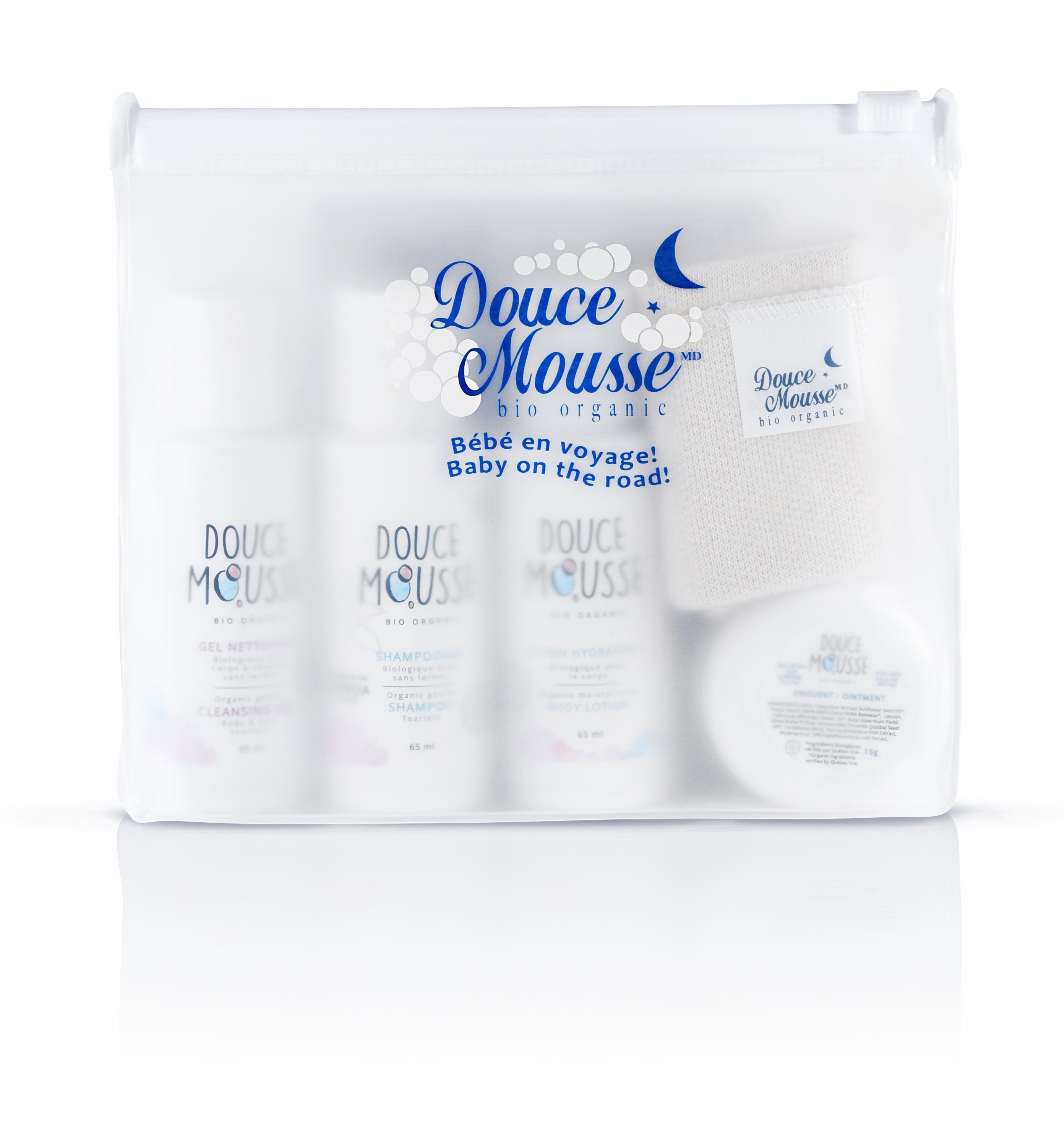 Idéal pour le sac à couche ou pour les visites chez les grands-parents, la trousse Douce Mousse »bébé en voyage » comprend: