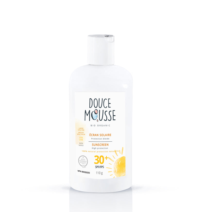 Tous les ingrédients de l’écran solaire Douce Mousse MD rencontrent les normes les plus sévères en matière de formulation naturelle et biologique. (sans pesticides, renouvelable et biodégradable) Ingrédient principaux: Huile de jojoba biologique: L’un des ingrédients préférés des peuples Aztèques, l’huile de jojoba est hydratante et humectante et convient aux peaux les plus sensibles. Beurre de karité biologique: Utilisé en Afrique depuis des millénaires, cet ingrédient est très hydratant en plus d’assouplir la peau. Huile de tournesol biologique du Québec: Riche en vitamine E, très hydratante et adoucissante. Huile de buriti: Directement de la forêt amazonienne du Brésil, très riche en caroténoïdes, antioxydant et photoprotecteur. Prévient des dommages du soleil et donne une jolie couleur beige-orangée à notre lotion solaire. L’oxyde de zinc: Ingrédient naturel très efficace pour protéger du soleil. Devient transparent à l’application lorsque ajouté dans une formulation de qualité.