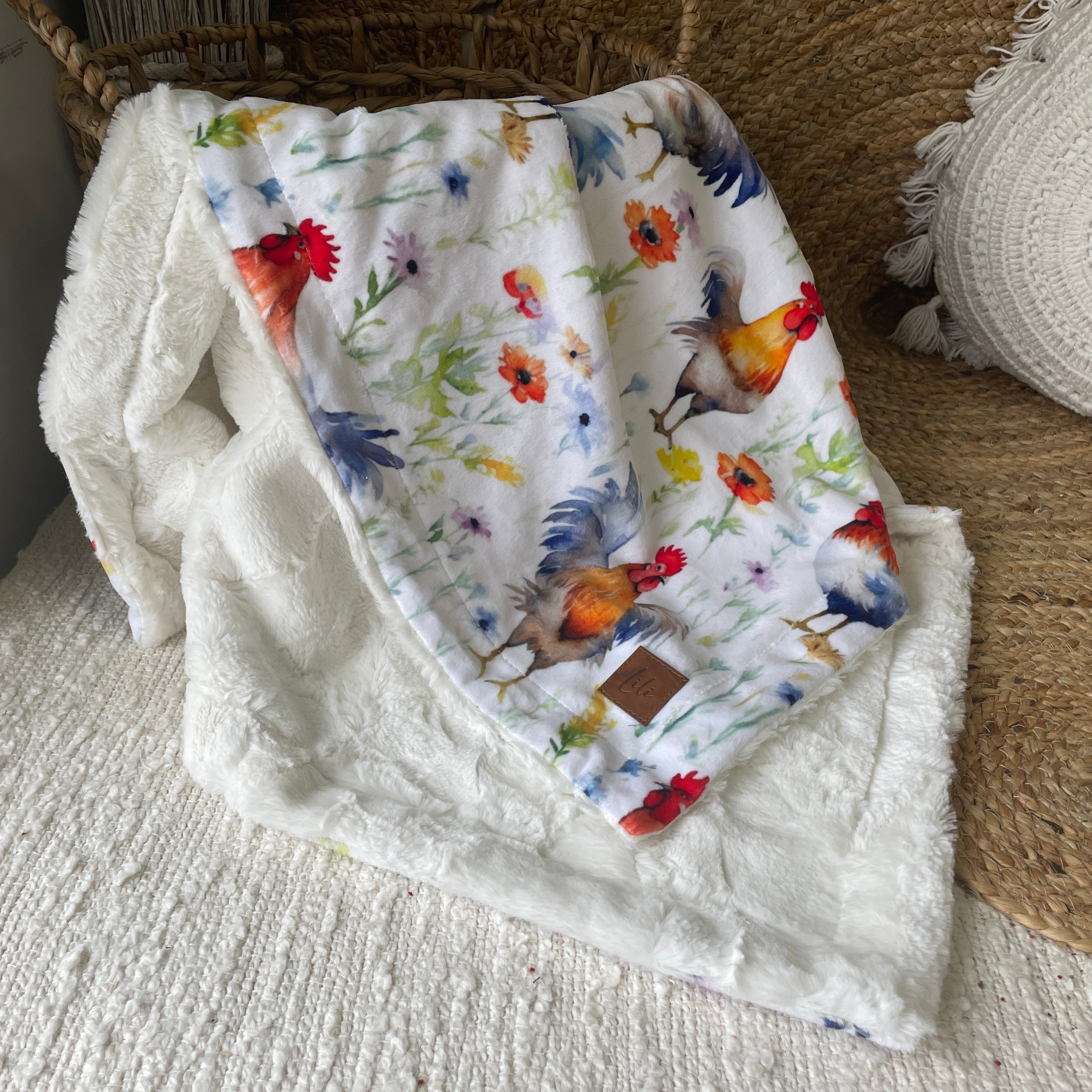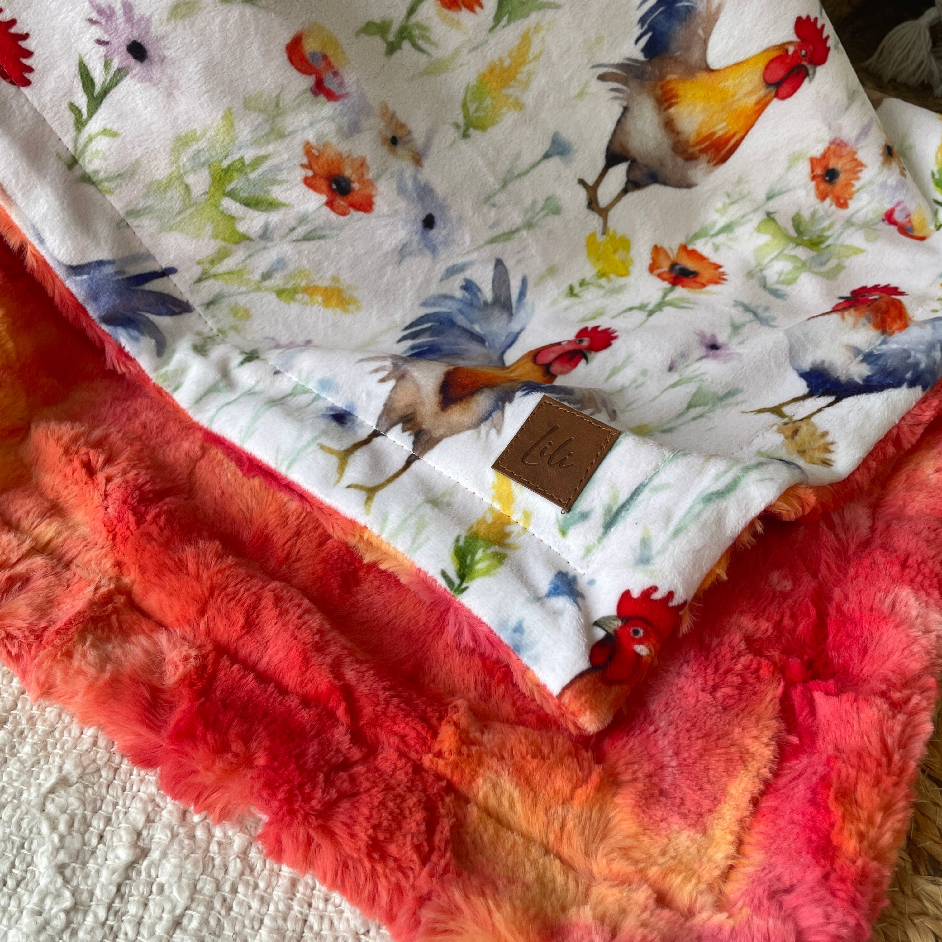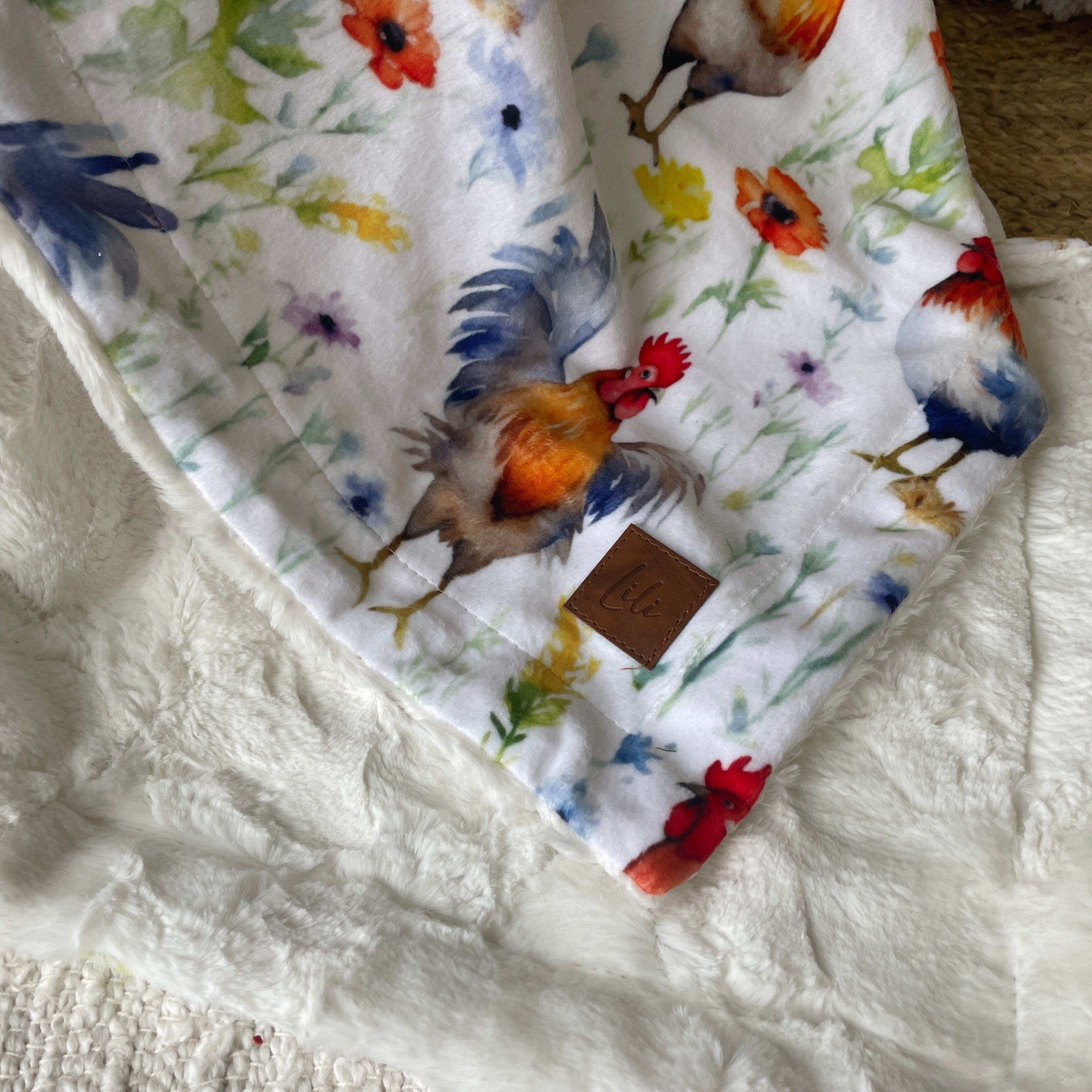 Un côté motif en minky imprimé au Québec ou en Amérique du Nord (pour certains motifs)