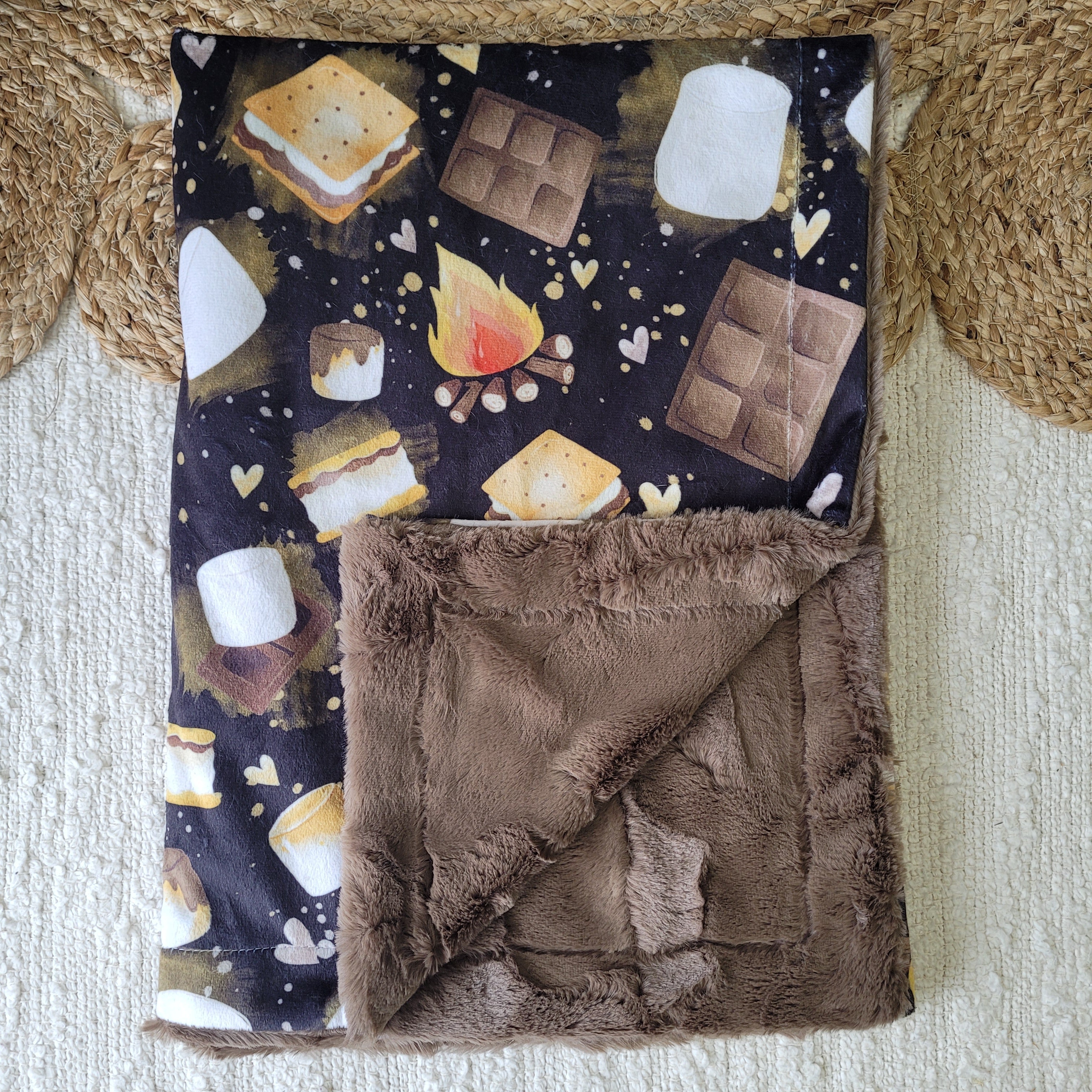 Un côté motif en minky imprimé au Québec ou en Amérique du Nord (pour certains motifs)