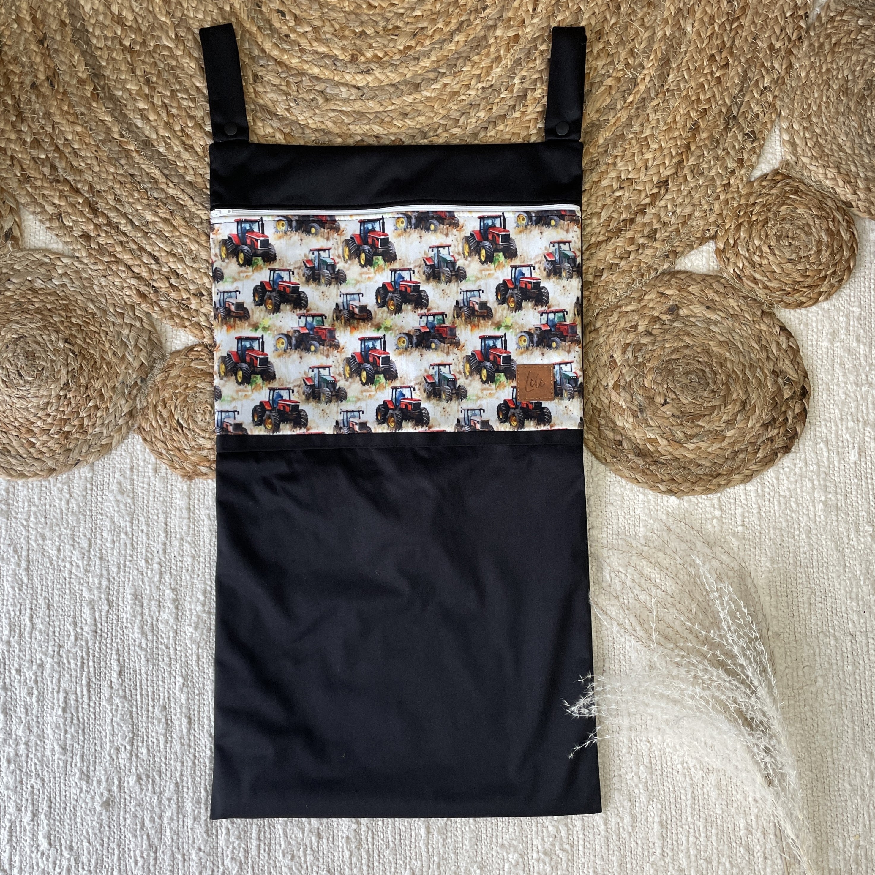 Il s’agit d’un sac à lessive que l'on peut suspendre pour couches souillées signé Les confections Lili. Le sac à suspendre est fabriqué de deux épaisseurs de polyester laminé (PUL) 100% polyester et d'une bande à motif pour un look des plus élégant.