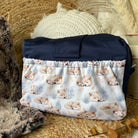 Notre sac est fabriqué de polyester laminé (PUL) 100% polyester et entièrement doublé de PUL blanc pour encore plus de résistance et étanchéité. Les deux poches à motifs sont en pk doublé de pul.