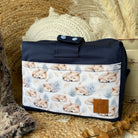 On y range 8 couches de taille unique avec un insert de jour Lili ou 6 avec un insert de nuit.  Il contient une poche à motif à l'avant pour y ranger votre téléphone, portefeuille ou protège-carnet de santé. Il contient une autre poche à motif à l'arrière avec élastique pour vous permettre d'apporter des articles plus volumineux comme un paquet de lingettes humides par exemple ou bien une crème de change.