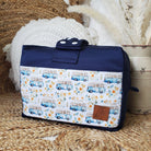 Notre sac est fabriqué de polyester laminé (PUL) 100% polyester et entièrement doublé de PUL blanc pour encore plus de résistance et étanchéité. Les deux poches à motifs sont en pk doublé de pul.