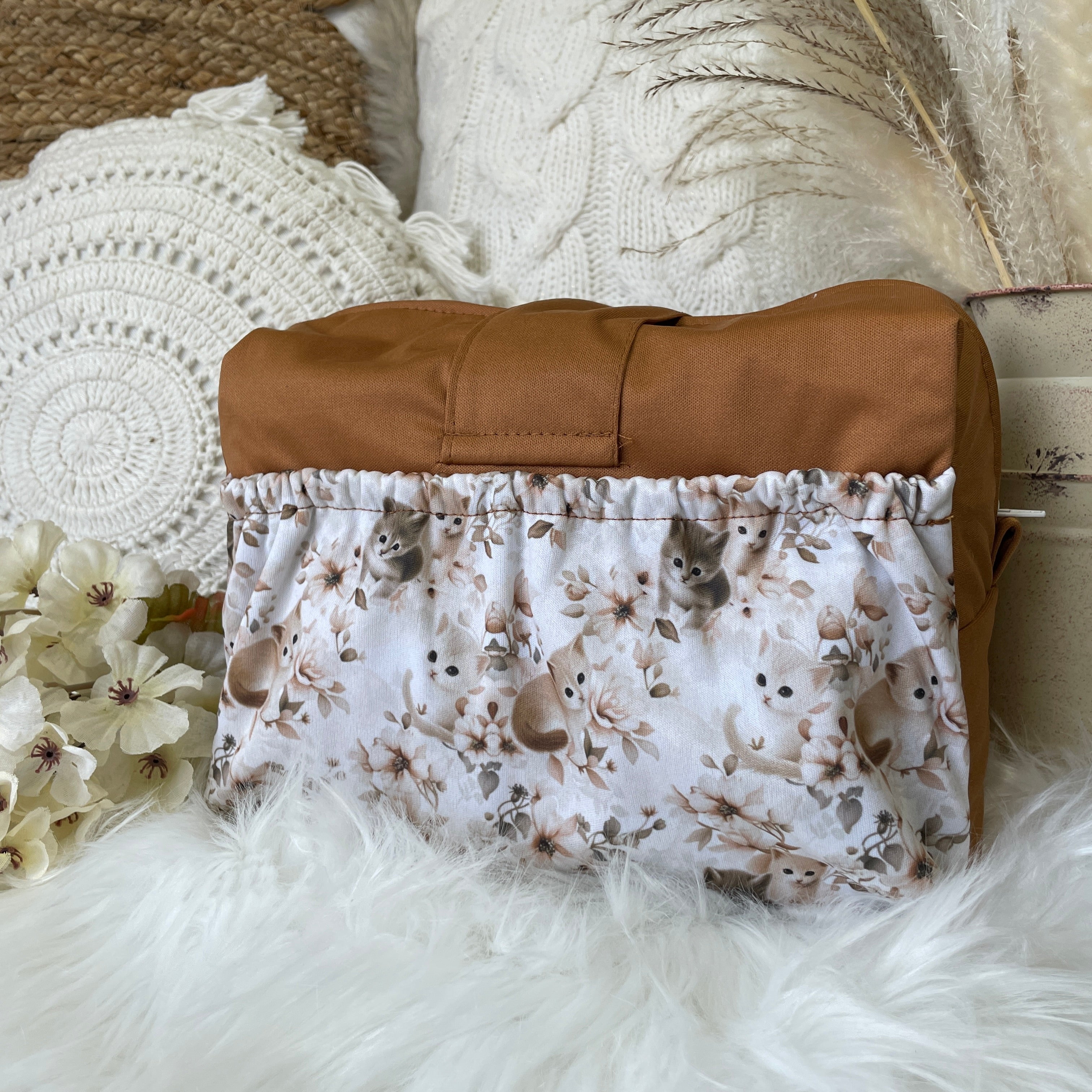 On y range 8 couches de taille unique avec un insert de jour Lili ou 6 avec un insert de nuit. Il contient une poche à motif à l'avant pour y ranger votre téléphone, portefeuille ou protège-carnet de santé. Il contient une autre poche à motif à l'arrière avec élastique pour vous permettre d'apporter des articles plus volumineux comme un paquet de lingettes humides par exemple ou bien une crème de change.