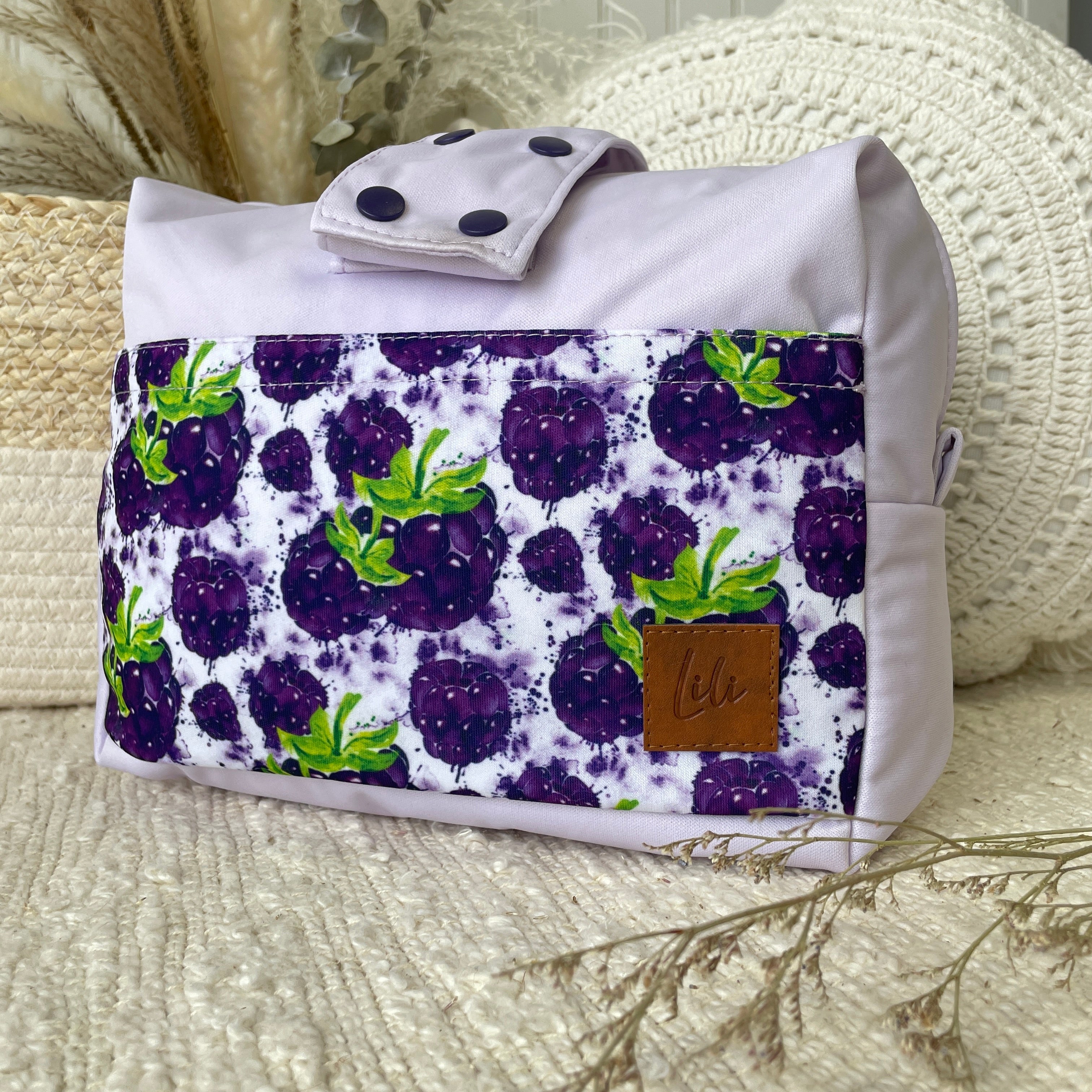 On y range 8 couches de taille unique avec un insert de jour Lili ou 6 avec un insert de nuit. Il contient une poche à motif à l'avant pour y ranger votre téléphone, porte-feuille ou protège-carnet de santé. Il contient une autre poche à motif à l'arrière avec élastique pour vous permettre d'apporter des articles plus volumieux comme un paquet de lingettes humides par exemple ou bien une crème de change.